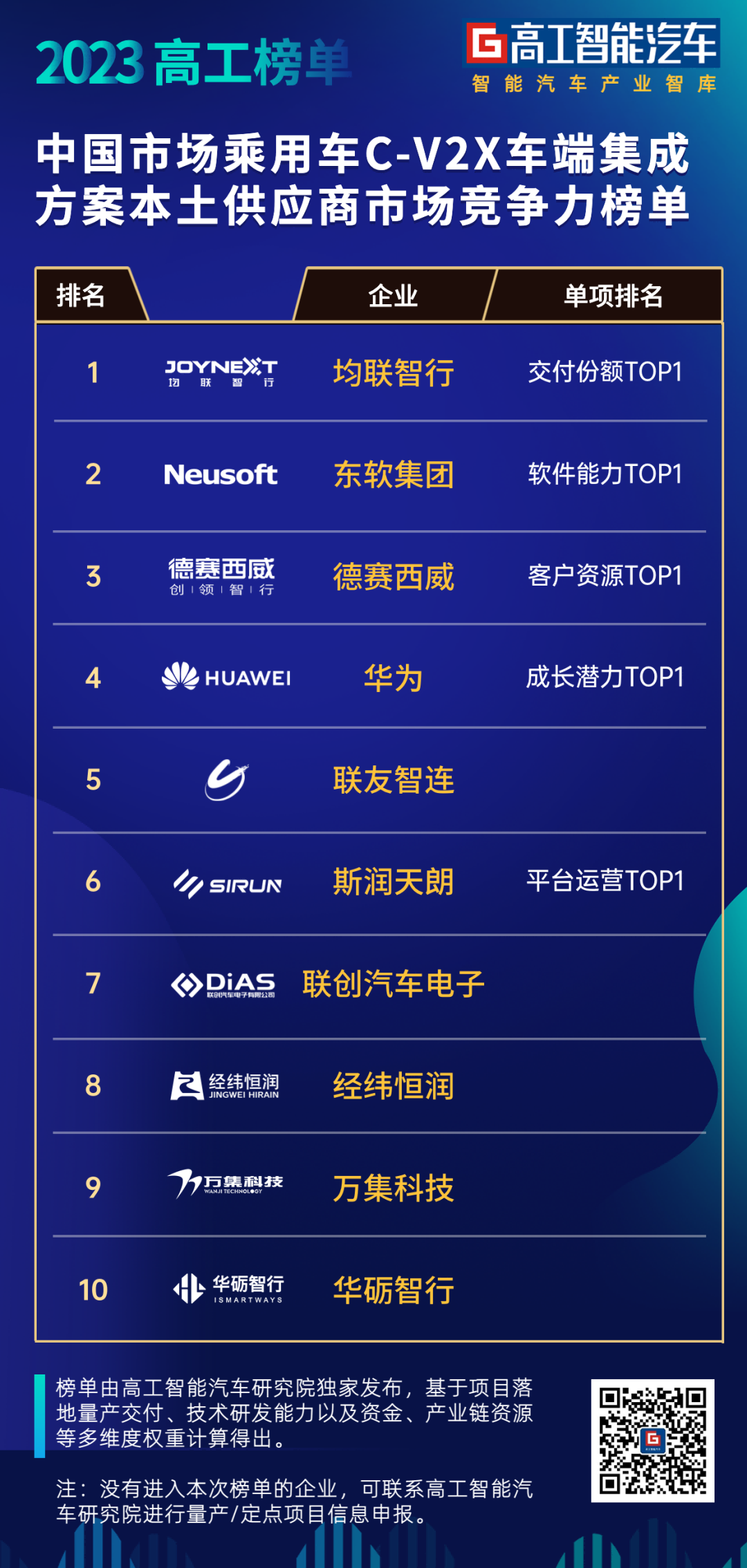 近日,高工智能汽車研究院發(fā)布了“2023年度乘用車C-V2X車端集成方案本土供應(yīng)商競(jìng)爭(zhēng)力榜單TOP10”,斯?jié)櫶炖食晒θ脒x,并被評(píng)為平臺(tái)運(yùn)營TOP1,這是對(duì)斯?jié)櫶炖试贑-V2X領(lǐng)域綜合實(shí)力的認(rèn)可與肯定。