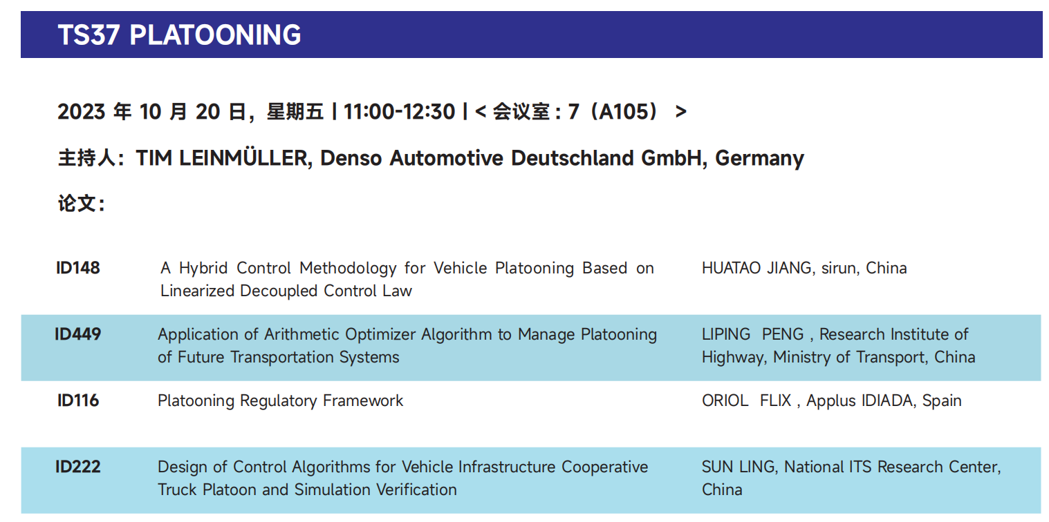 經(jīng)過ITS國際組委會的專業(yè)遴選,該論文成功入選第29屆智能交通世界大會。10月20日上午,斯?jié)櫶炖蕦⑹苎麉⒓蛹夹g(shù)論文會議:TS37 Platooning,屆時將對論文內(nèi)容進行技術(shù)解讀,并介紹斯?jié)櫶炖试?/span>V2X網(wǎng)聯(lián)環(huán)境下車輛列隊行駛方面所做的相關工作。