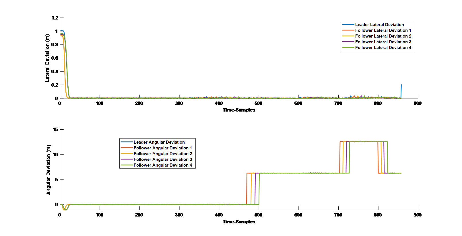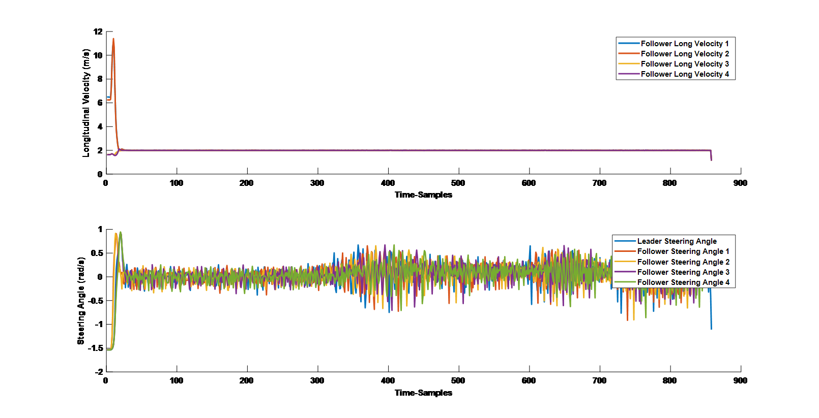由模型的仿真結(jié)果可以看出,車隊中各個車輛的縱向速度、橫向方向盤轉(zhuǎn)角能夠保持比較好的一致性,路徑跟蹤也取得了比較好的效果,驗證了本論文所提出的混合控制算法的有效性。