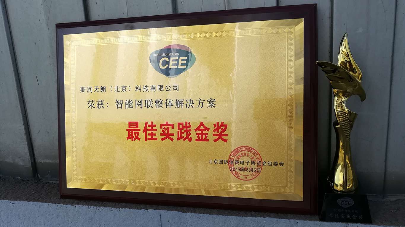 2018年6月28日,第十七屆北京國際消費電子博覽會(CEE 2018)在北京亦莊隆重舉行,斯?jié)櫶炖蕯y智能硬件T-BOX等產(chǎn)品亮相展會,并獲頒智能網(wǎng)聯(lián)整體解決方案最佳實踐金獎。